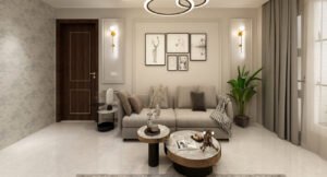 Neutral shade fabrics blend well with soothing wall tones and minimalist interior decor. Smaller furniture and pastel colors look sharp and require light maintenance; perfect for a low-effort living room interior design.